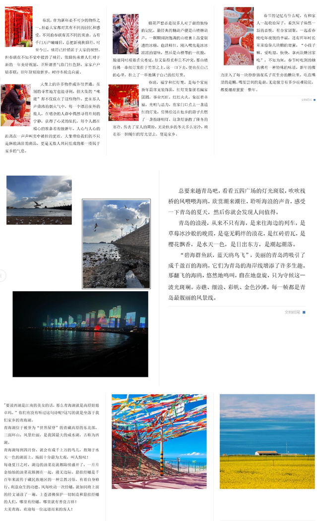 活动分为图文组与视频组,通过录制短视频、图文等方式向大家展示自己独具特色的家乡,增添家乡韵味。图文组同学将气氛祥和的家庭聚餐、人杰地灵的秀美山景、独具特色的家乡特产、琳琅满目的年货大集等家乡景色定格一瞬,清晰且构图完整的图片引发大家对家乡的想象,配上优美文字充分地让图片活起来、动起来;摄影组同学化身家乡小导游,在视频中从容熟练的介绍生己、养己、育己的家乡,从特色小吃、风俗特产到民风民俗、节日特色再到崇山峻岭,向大家介绍各有风格的家乡美景,带领大家体会充满烟火气的独有氛围,为自己的家乡代言。