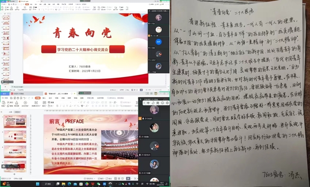 本次活动以“指尖笔墨,厚‘记’薄发”为主题,活动分为三个板块。“一日之计”假期学习笔记展示活动中,整洁美观、条理清晰的笔记,深刻展现了同学们脚踏实地、锲而不舍的学习精神;“青春向党”学习党的二十大精神心得交流会中,同学们将自己的学习心得通过腾讯会议进行笔记分享交流,抒发同学们爱党爱国爱社会主义的情怀;“时政新篇”学习时政成果展示中,同学们通过PPT、短视频等形式展示学习成果,彰显了时代青年对于国家大政方针、时政热点的独立思考。从学习笔记再到时政探讨,无一不展现出同学们对于学习的孜孜不倦,发扬了91porn 学子持之以恒的学习精神。