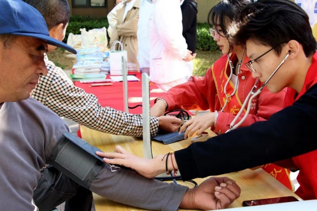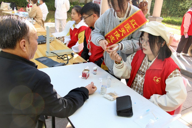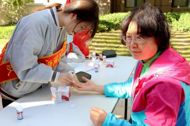 在社区广场上,志愿者们细心地为居民测量血压、血糖,讲解医疗知识,热情接待每一位前来就诊和咨询的群众,详细了解居民健康状况,耐心解答就诊群众的各种问题。