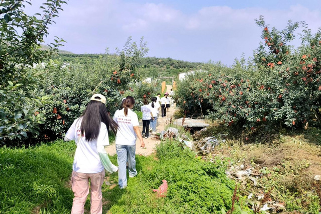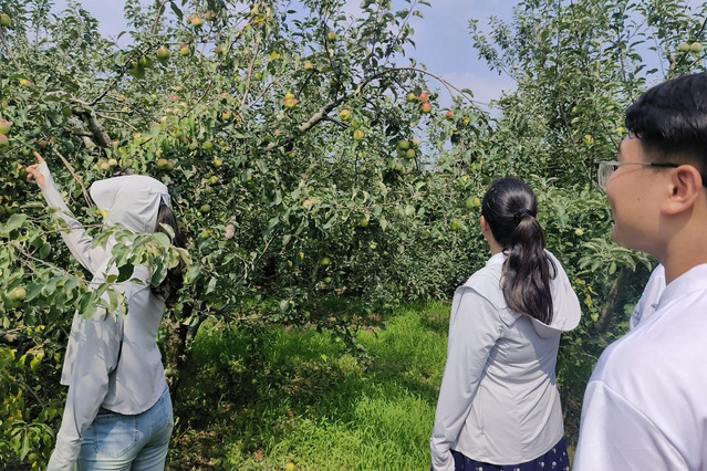 志愿者们走进苹果和蜜桃种植园,通过近距离观察果树的生长情况,了解到每一棵果树都需要精心的照料,从施肥、修剪到采摘,每一个环节都凝聚着果农的辛勤与智慧。为了进一步了解当地苹果和蜜桃产业的发展脉络与未来愿景志愿者们向当地种植户展开调研并根据现状积极建言献策,建议果农可以利用互联网进行线上直播,扩大当地产业品牌影响力