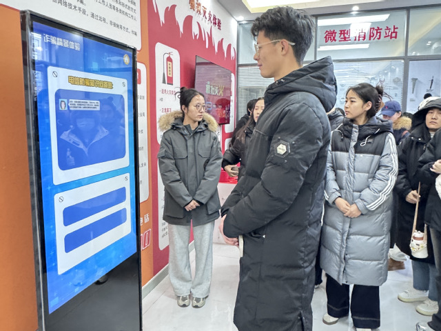 张乐扬首先引导同学们参观微型消防站和模拟灭火体验区,介绍各类消防设备,重点讲解了手提式灭火器的类型和使用方法。同学们纷纷上手实操,掌握了“提拔握压”的灭火技巧。