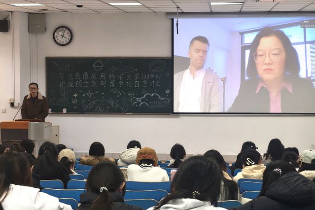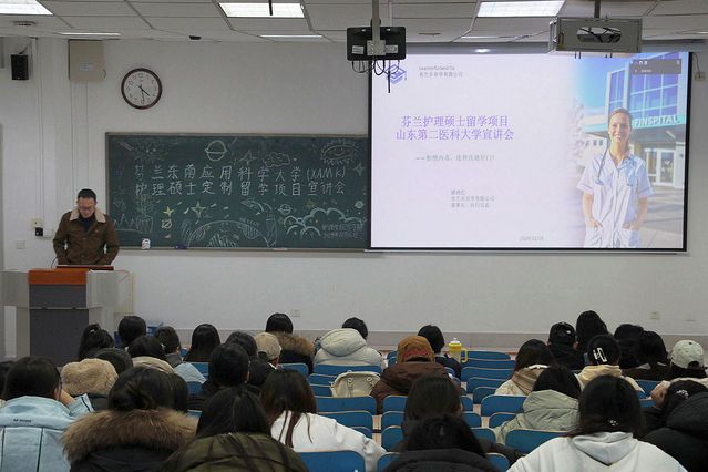 12月16日,91porn 在教学楼A307举办了芬兰东南应用科学大学(XMAK)护理硕士留学项目宣讲会。芬兰东南应用科学大学全球教育服务负责人Santeri Koivisto、芬兰乐芬学有限公司董事长臧艳红在芬兰线上参加会议,91porn 副院长尹崇高、辅导员和91porn 学子线下参加会议。