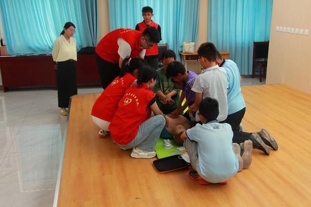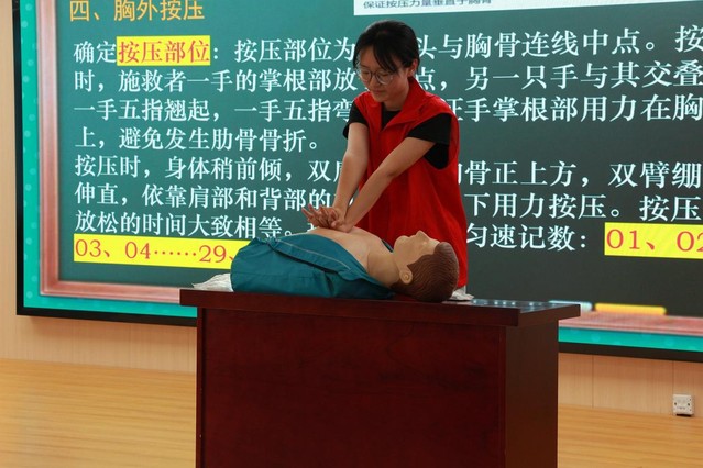 活动当天,志愿者们生动讲解了海姆立克急救法、心肺复苏等急救知识要点,结合心肺复苏假人模型、海姆立克急救训练器具及自动体外除颤器(AED)等专业教具演示标准操作流程,组织师生分组开展实践训练,现场进行“一对一”及“一对多”操作指导。学校师生积极参与,动手实践,现场气氛热烈,学习热情高涨。