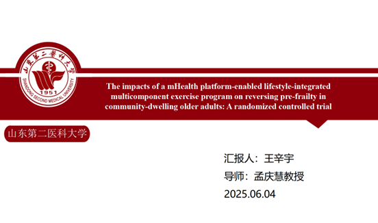 研究生吕娅宁分享了一篇关于胃癌术后患者营养管理的随机对照试验。这是一项由护士主导、基于健康行动过程理论(HAPA)设计的个体化mHealth营养干预。通过“iNutrition”微信小程序(提供个性化食谱、营养计算、症状管理及同伴交流)结合定期电话咨询,显著改善了患者的营养状况(PG-SGA评分)、增加了能量与蛋白质摄入、减少了体重丢失,并强化了患者的营养行为相关认知信念,凸显了护士在术后延续性护理中的核心作用。研究生王辛宇汇报了一项针对社区衰弱前期老年人的随机对照试验,其研究创新性地通过移动健康平台,将包含柔韧性、平衡性、抗阻和有氧训练的多组分运动方案整合到老年人日常生活中。结果显示,该干预方案能显著逆转衰弱前期状态,并有效改善身体功能、骨密度及减少久坐行为。研究为解决中国老龄化问题提供了可复制、低成本的数字化干预新思路。