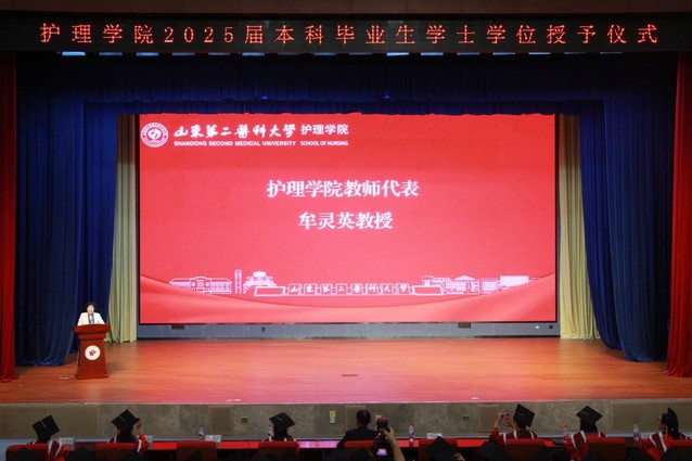 孟庆慧在致辞中代表学院向圆满完成学业的全体毕业生表示最热烈的祝贺。她谆谆嘱托即将步入社会的护理学子,在未来职业生涯中,要持续精进专业技能,秉持仁爱之心,恪守南丁格尔精神,以高度的专业素养和责任担当,守护人民生命健康。教师代表牟灵英教授在发言中向毕业生们表达了深切的期望与诚挚的祝福。她嘱托毕业生们要牢记专业使命,以扎实的专业素养和深厚的人文情怀守护生命健康。优秀毕业生代表徐新媛代表全体毕业生,向母校的悉心培育和老师们的教诲致以衷心的感谢,郑重承诺将不负母校和老师们的培养,恪守职业准则,服务人民,以仁心仁术践行南丁格尔誓言。随后,学院导师代表为全体本科毕业生逐一拨穗正冠并合影留念。最后,尹崇高代表学院再次向毕业生致以诚挚祝贺,并向辛勤耕耘的全体教职员工表示衷心感谢。