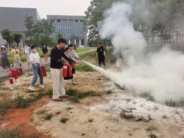 朱俊义副处长结合近年高校火灾案例,深入剖析实验室、宿舍及公共场所的火灾隐患成因与预防措施,重点讲解火场逃生“弯腰低姿、湿巾捂口鼻”等自救技巧,详细演示了灭火器、消防栓的“提、拔、握、压”操作规范,并强调易燃试剂存放规范,提高学院“检查消除火灾隐患、组织扑救初起火灾、组织人员疏散逃生和消防宣传教育培训”四个能力和意识。理论培训后,保卫处工作人员在文体中心东侧现场演示了灭火器的使用方法。师生们积极参与,认真学习灭火器的“提、拔、握、压”操作要领,成功扑灭模拟火源。