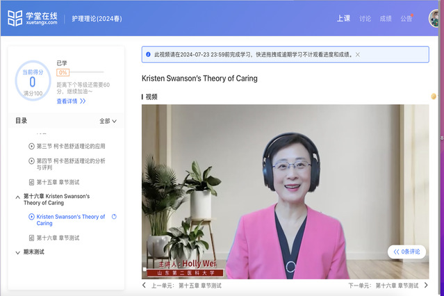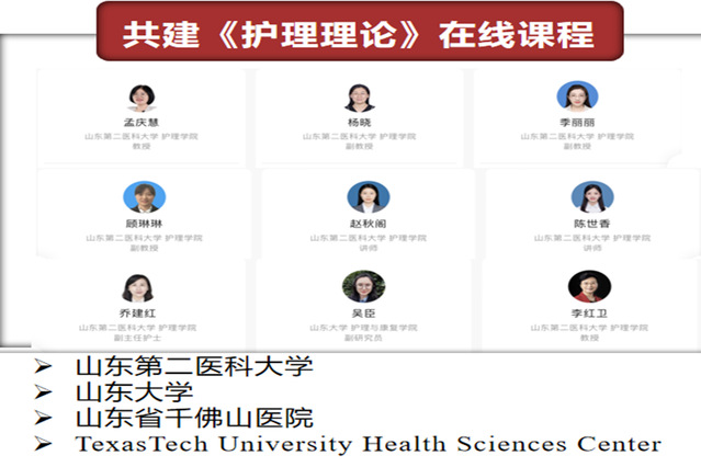 举办国际论坛、开设国际课程,共建在线课程。连续4年每年举办“智・和”国际护理研究生创新论坛,邀请国外专家作专题报告。美国德克萨斯理工大学李红卫教授、新加坡国立大学董艳红教授每年为本校护理研究生开设1-2门国际课程。李红卫教授还参与了研究生《护理理论》在线课程的建设。